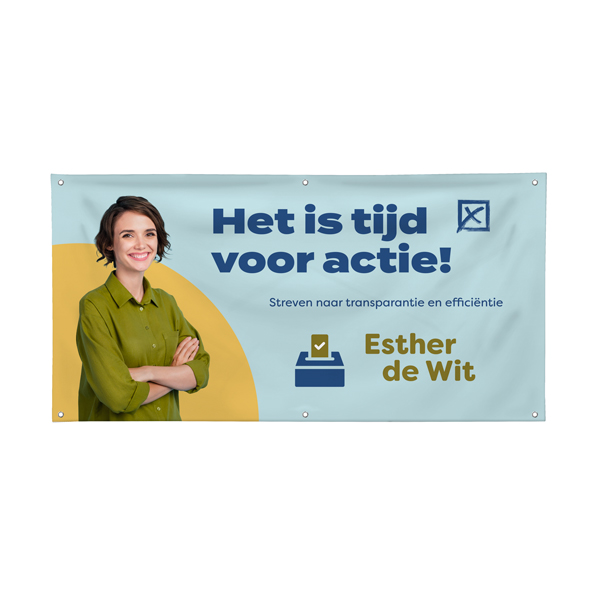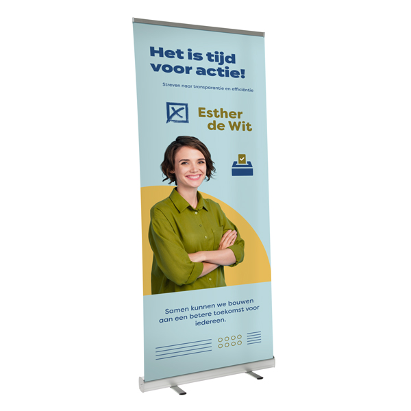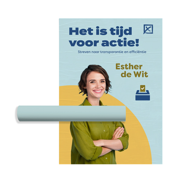 Terwijl politieke visitekaartjes bedoeld zijn om in de zakken of portemonnees van kiezers bewaard te worden, is het doel van campagneposters om de politieke boodschappen van de kandidaat zo zichtbaar mogelijk te maken. Daarom bieden we grootformaat buitenposters aan, gedrukt in hoge definitie met de nieuwste technologie. Er zijn 12 vooraf gedefinieerde formaten om uw boodschappen volledige zichtbaarheid en aanpasbaarheid te geven. Voor de afdruk gebruiken we Magistra Deluxe Blueback 120 gsm papier, dat scheurbestendig is en heldere kleuren produceert.